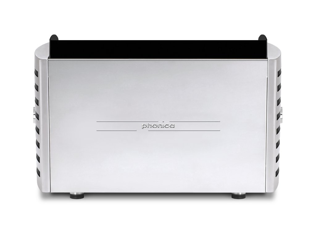 Phonica patří mezi designově nejvýraznější modely Orchestrale. Charakteristické boční perforace, masivní nerezové tělo a kontrastní prvky z černého methakrylátu odkazují na estetiku vintage audia a industriální techniky.